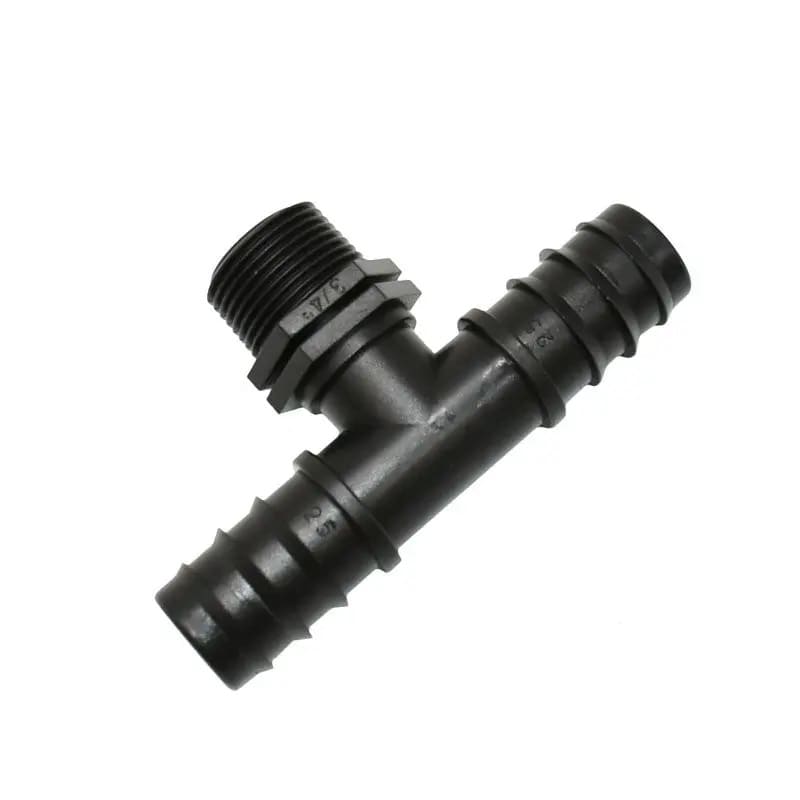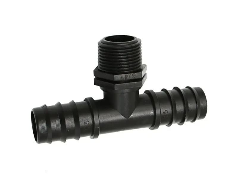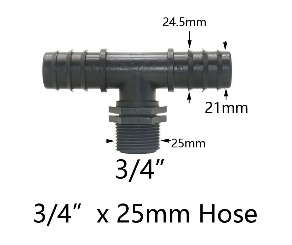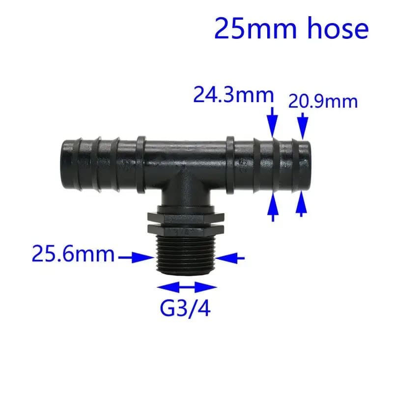 - 25mm-3/4 inch-25mm Tee Connector is suitable for 25mm drip irrigation pipe and 3/4” threaded pipe.