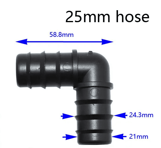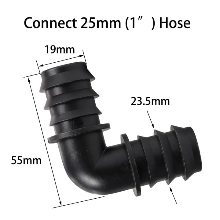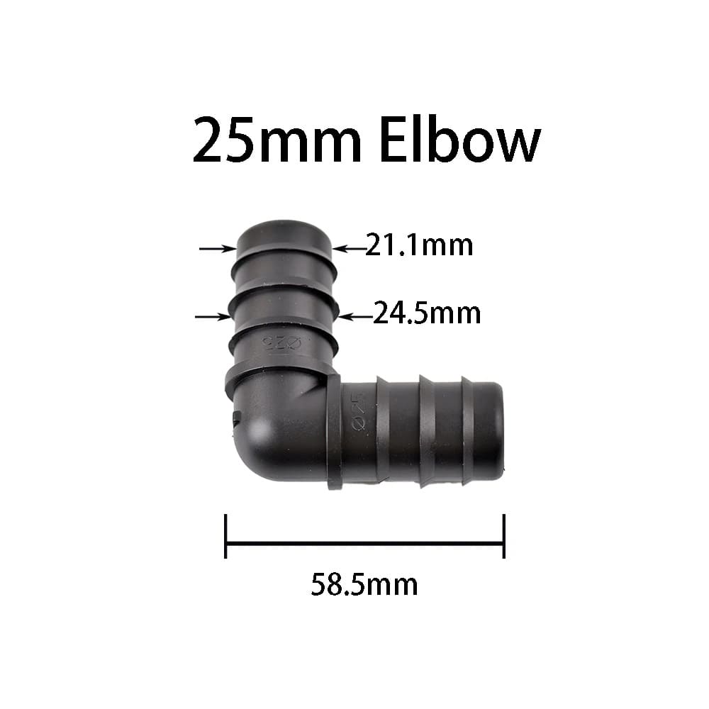 - 25mm Elbow fits drip irrigation pipe with 25mm diameter.