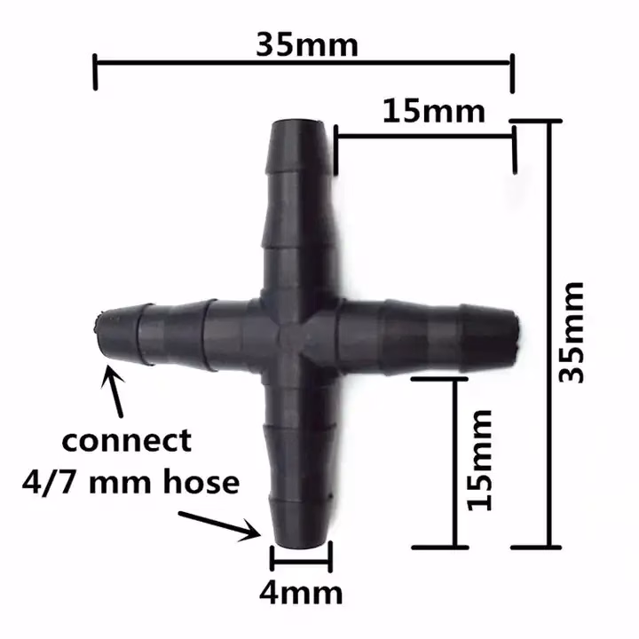 Overall, the Four Way Cross Tee for 4/7mm Drip Irrigation Pipe is a perfect choice for efficient irrigation management. It saves time, water, and effort by ensuring accurate distribution through multiple lines. Therefore, it is ideal for home gardens, nurseries, and agricultural fields that need effective water control.