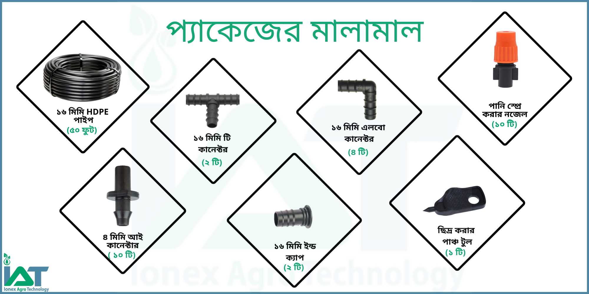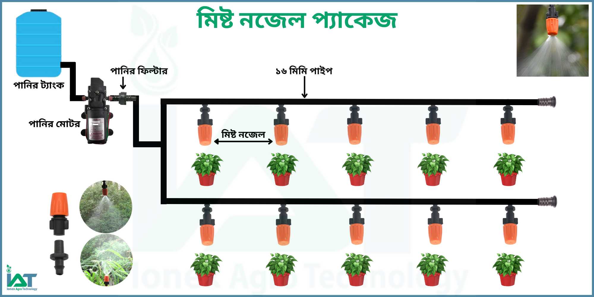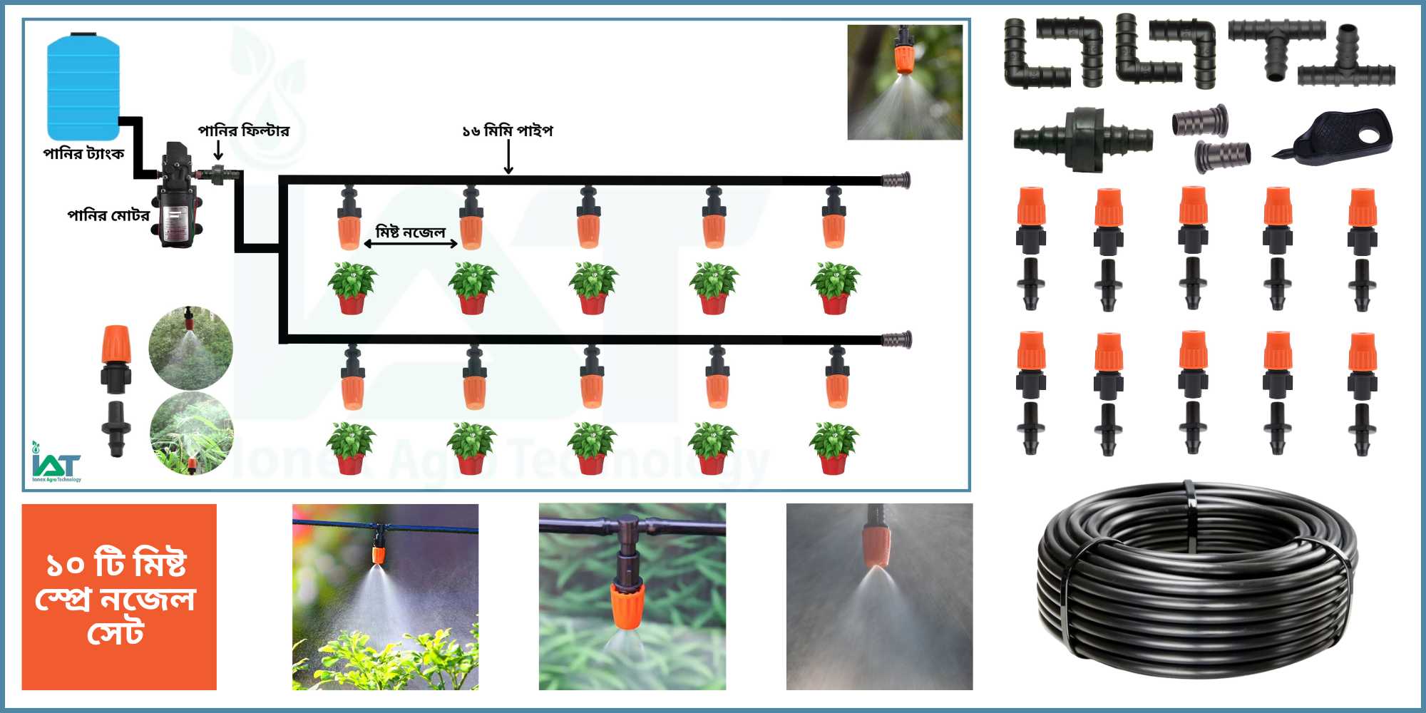 ১০ টি মিষ্ট নজেলের প্যাকেজ, ১৬মিমি HDPE পাইপ, পানির ফিল্টার, এলবো, টি-কানেক্টার, ইন্ড ক্যাপ এবং ছিদ্র করার পাঞ্চ টুল সহ বাগানে পানি সেচের একসেট প্যাকেজ ।